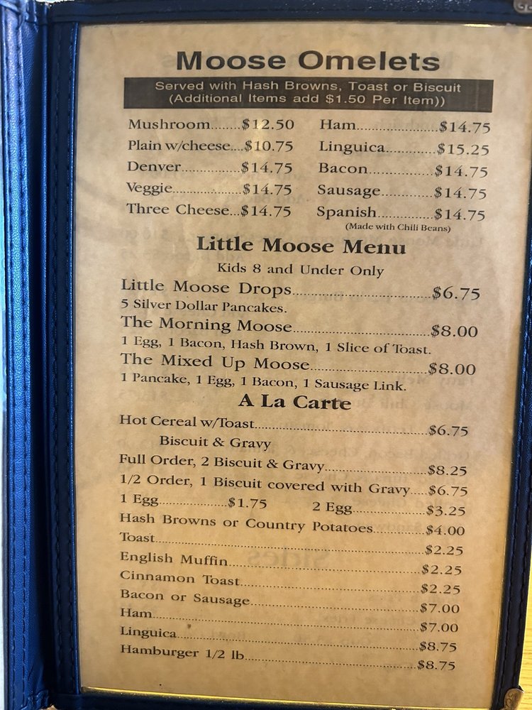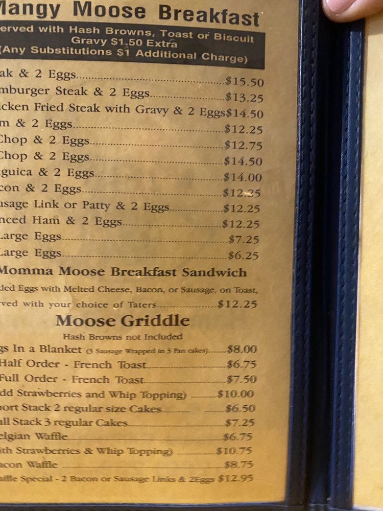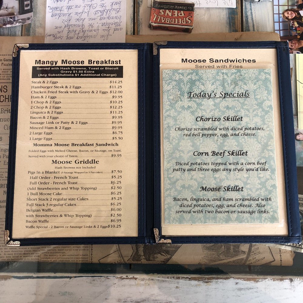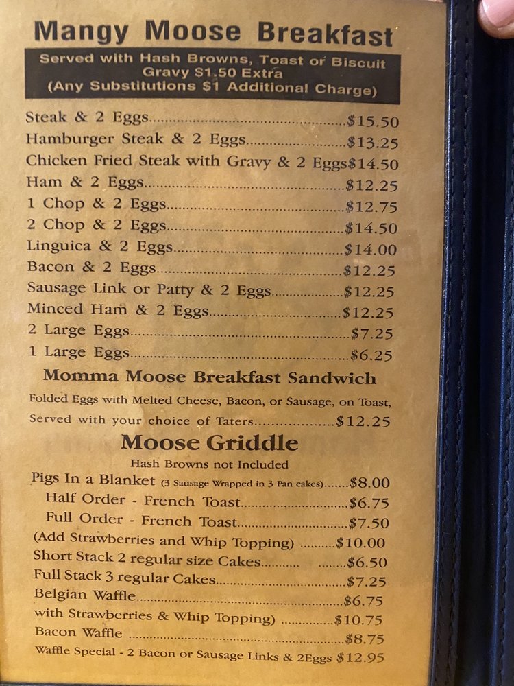 Introducing the menu at Mangy Moose Cafe, located in Manteca, CA, a cozy breakfast and brunch spot offering American cuisine. This charming eatery provides vegan and vegetarian options, takes reservations, and even accepts cryptocurrency. The reviews rave about the outstanding service and delicious food, with generous portions and unique dishes like veggie omelets and moose skillets. Customers commend the friendly staff, quick service, and homey atmosphere. Highlights include the huge portions, flavorful biscuits and gravy, and hearty meat-filled omelets. The Moose decor adds to the quaint feel of the small diner, making it a must-visit spot for a classic American breakfast. Come for the food, stay for the welcoming vibes at Mangy Moose Cafe.